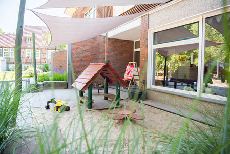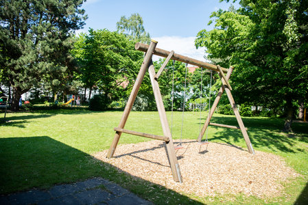 Die große Wiese bietet den Kindern viel Lauffläche. Gleichzeitig finden die Kinder viele idyllische Plätze zum Beobachten, Schaukeln, Turnen, Balancieren und zum gemütlichen Zusammensein.